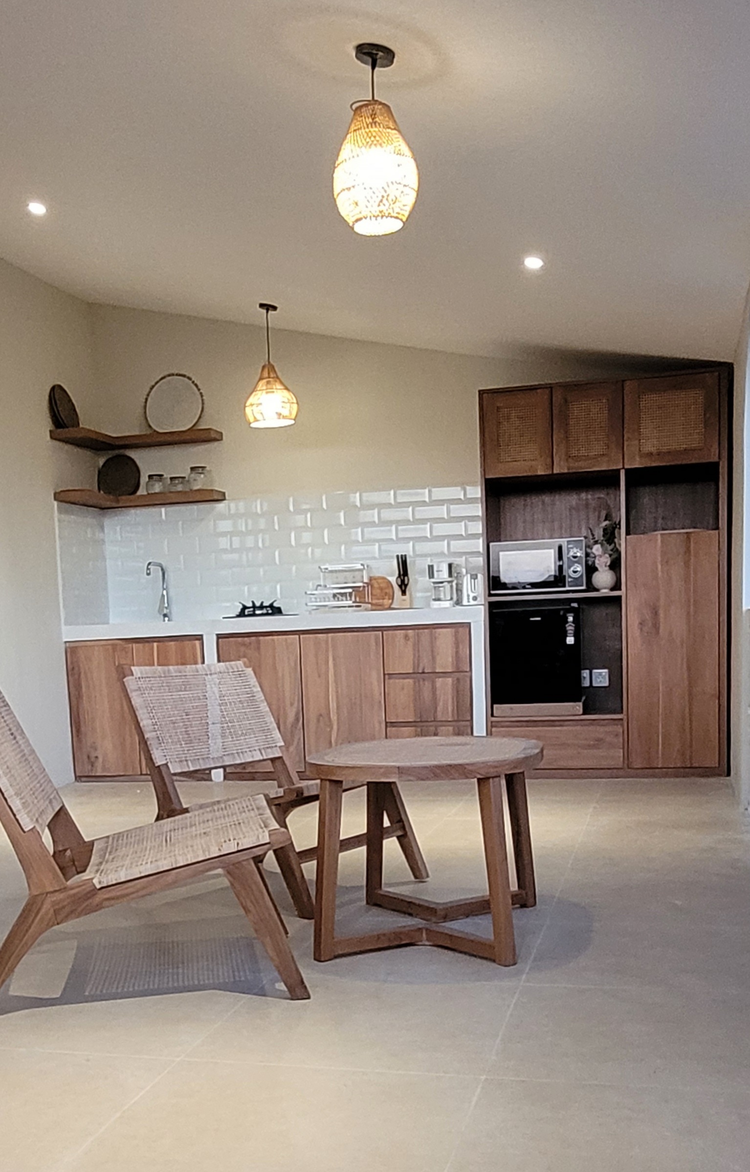Escape to a brand-new Mediterranean-inspired villa in the heart of Canggu! Enjoy an upgrade of this Private Studio with ensuite room with a king bed, workspace, private kitchen and breathtaking views from your own terrace.
